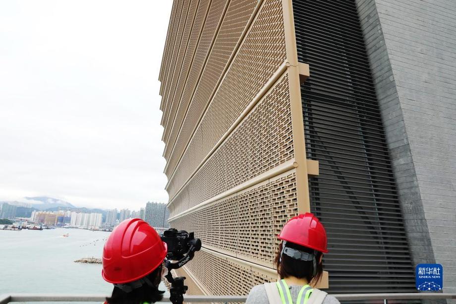 記者在拍攝香港故宮工藝獨特的外立面(10月22日攝)。