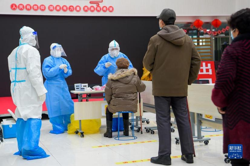 在內蒙古滿洲里市東山街道辦事處怡園社區府欣小區A區核酸采樣點,工作人員為居民做核酸采樣(2021年11月29日攝)。新華社記者李志鵬 攝