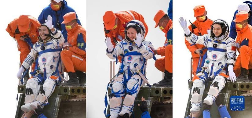 4月16日,神舟十三號載人飛船返回艙在東風著陸場成功著陸。這是航天員翟志剛、王亞平、葉光富(左至右)安全順利出艙(拼版照片)。新華社發