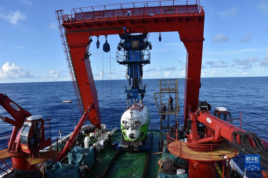 2021年8月18日,工作人員在西太平洋準備從“探索一號”科考船甲板布放“奮斗者”號。新華社記者 陳凱姿 攝