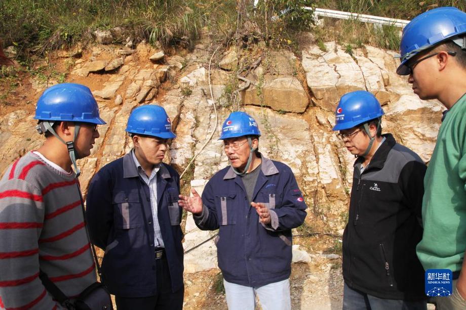 天文學家南仁東(中)與工程技術(shù)人員在大窩凼施工現(xiàn)場檢查施工進展(2014年12月1日攝)。新華社發(fā)(中科院國家天文臺供圖)