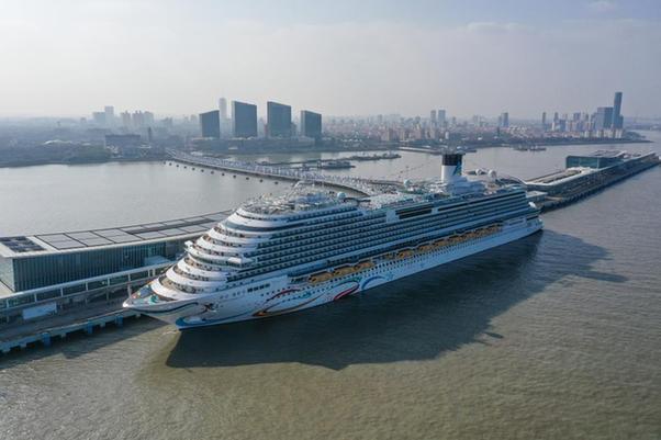 國產首艘大型郵輪“愛達·魔都號”停靠在上海吳淞口國際郵輪港(2024年1月1日攝,無人機照片)。新華社記者 丁汀 攝