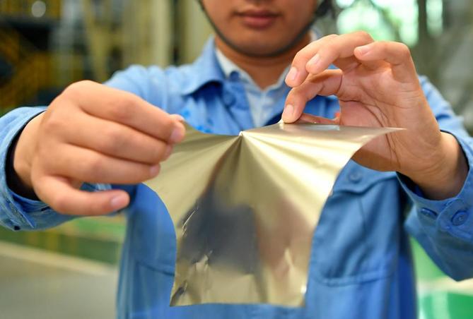 在位于山西的太鋼集團,員工展示用手撕開0.02毫米厚的超薄帶狀不銹鋼(2019年5月24日攝)。新華社記者 曹陽 攝