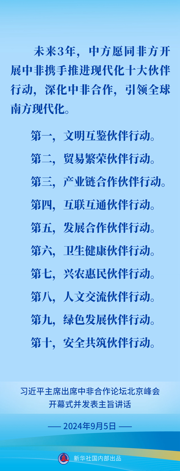 9月5日,習近平主席出席中非合作論壇北京峰會開幕式并發表主旨講話,宣布將實施中非攜手推進現代化十大伙伴行動。