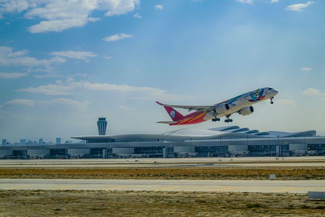 9月15日,一架飛機從烏魯木齊天山國際機場起飛。新華社記者陳朔 攝