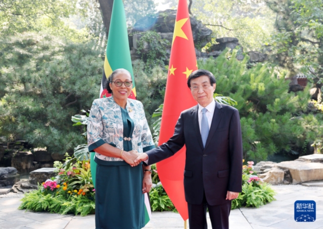 新華社北京10月14日電 全國政協主席王滬寧14日在京會見來華出席全球婦女峰會的多米尼克總統伯頓。