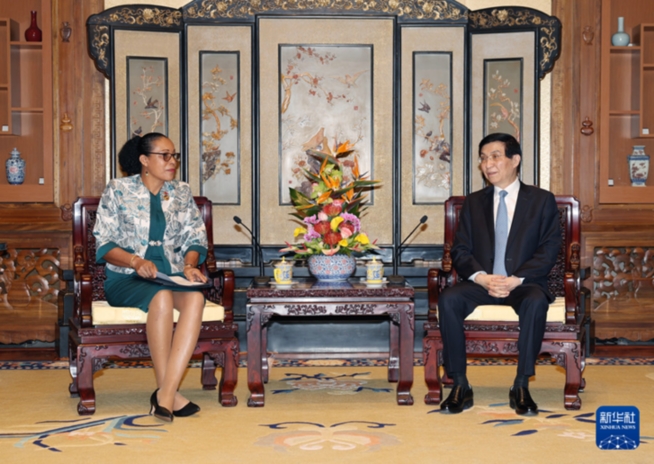 10月14日,全國政協主席王滬寧在北京會見來華出席全球婦女峰會的多米尼克總統伯頓。新華社記者 姚大偉 攝